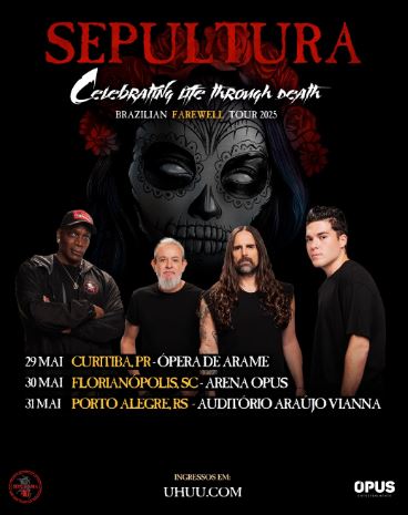 Já em Florianópolis, o quarteto está de volta a Arena Opus, neste sábado (30/05), para um tão aguardado reencontro com os fiéis seguidores de Santa Catarina. O encerramento do giro será no sábado (31/05), no Araújo Vianna, em Porto Alegre. Esta é a última chance de os fãs presenciarem um dos maiores nomes do metal em ação e celebrar o legado do Sepultura em sua última tour.