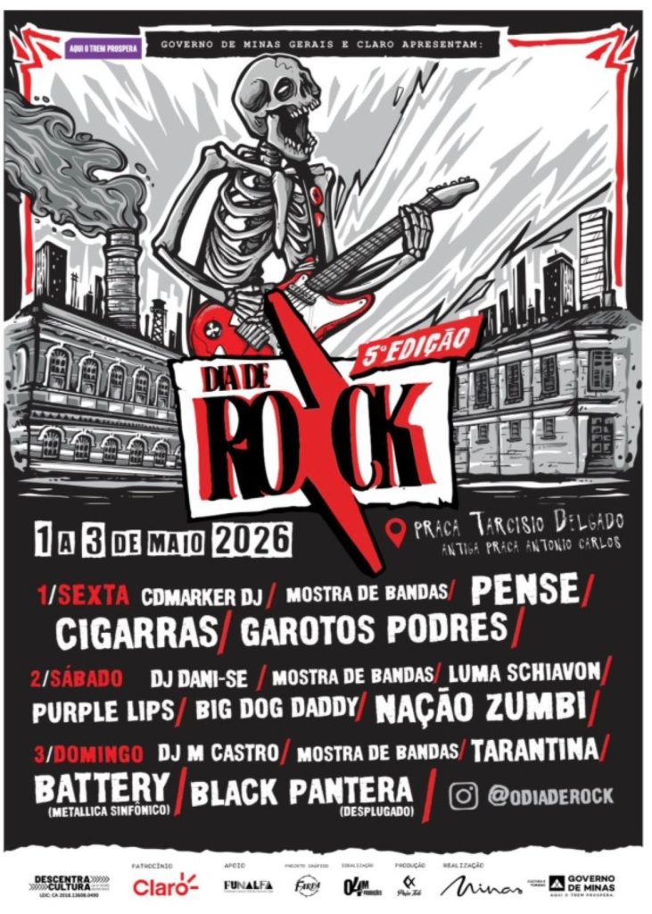 Com entrada gratuita e realizado em espaço público, o Dia de Rock mantém como princípio a democratização do acesso à cultura. “Essa característica faz parte da essência do evento: ocupar a cidade com música e aproximar o público da produção artística”, destaca Moura. O festival conta com patrocínio da Claro, por meio da Lei Estadual de Incentivo à Cultura de Minas Gerais e se consolida como um importante ponto de encontro da cena musical, contribuindo para fortalecer a cidade como um dos polos da música autoral no estado.